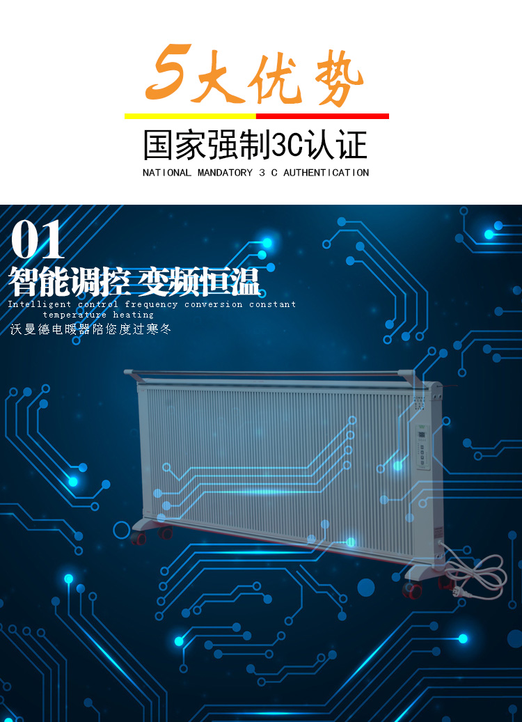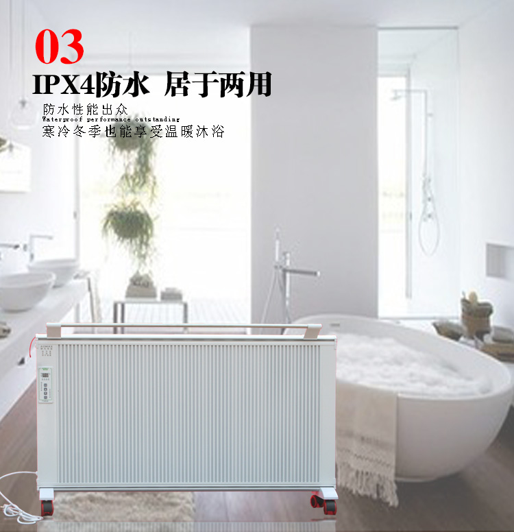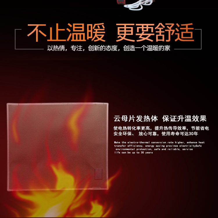 堅(jiān)固耐用,不易損壞,使用壽命長達(dá)20-30年。產(chǎn)品的零部件和整機(jī)均經(jīng)嚴(yán)格篩選、老化和檢測,導(dǎo)電強(qiáng)度超過國家標(biāo)準(zhǔn)2000V,其碳晶加熱體經(jīng)高壓復(fù)合而成,本產(chǎn)品重量輕、無污染、結(jié)構(gòu)堅(jiān)固、使用壽命不低于10萬小時(shí)。設(shè)有三層溫控 。1發(fā)熱體設(shè)有超溫保護(hù)開關(guān)。2溫控器設(shè)有散熱體保護(hù)關(guān)3室溫調(diào)節(jié)開關(guān)可設(shè)定取暖溫度的恒溫狀態(tài)。耐電擊強(qiáng)度3000伏以上。絕無磁波輻射。