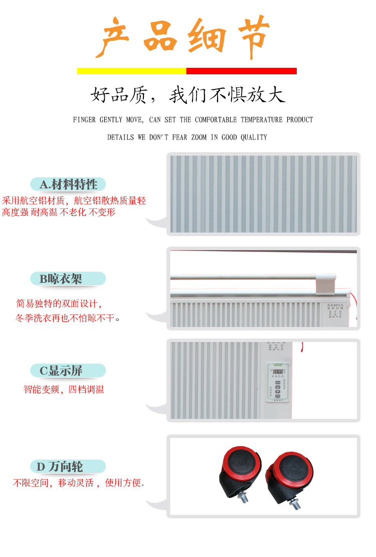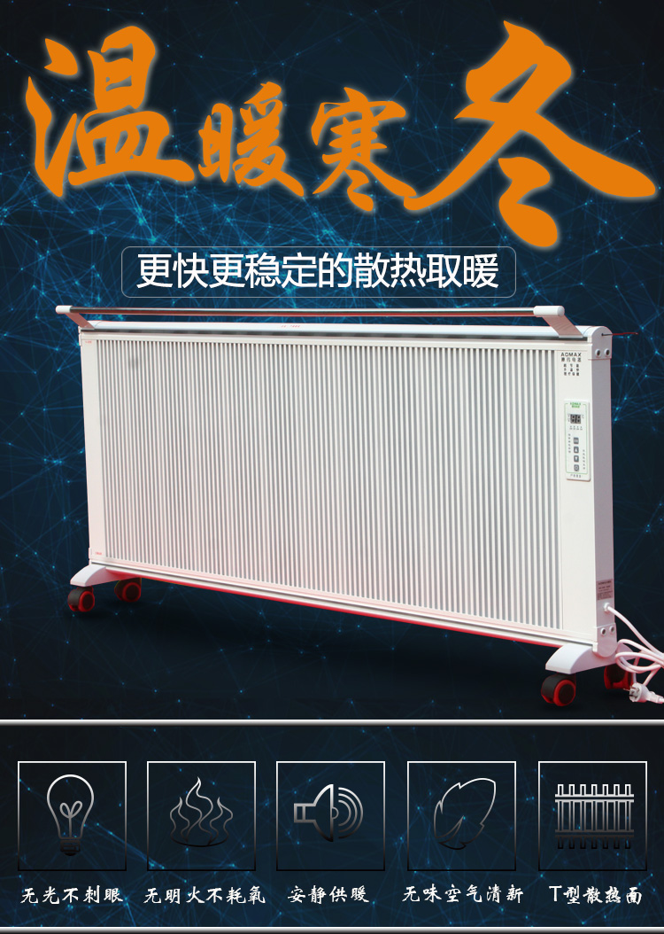 碳晶電暖器具有體積小重量輕、造型美觀大方、結(jié)構(gòu)堅(jiān)固耐用,無需增加任何配件,可隨意變換移動(dòng)使用位置等特點(diǎn)。發(fā)熱體,可隨意移動(dòng),任意放置,且可隨意攜帶,是家用采暖的創(chuàng)舉。